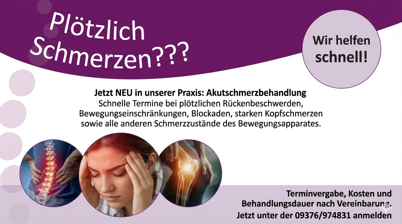 Ob akute Beschwerden, chronische Schmerzen oder präventive Behandlung – wir begegnen Ihnen mit fachlicher Kompetenz, echter Begeisterung für unseren Beruf und dem Blick für den ganzen Menschen.